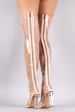 These over-the-knee boots feature a sheer lucite upper with vegan patent leather trim, center seam detail, pointy toe silhouette, and chunky clear heel. Finished with a cushioned insole and rear zipper closure.